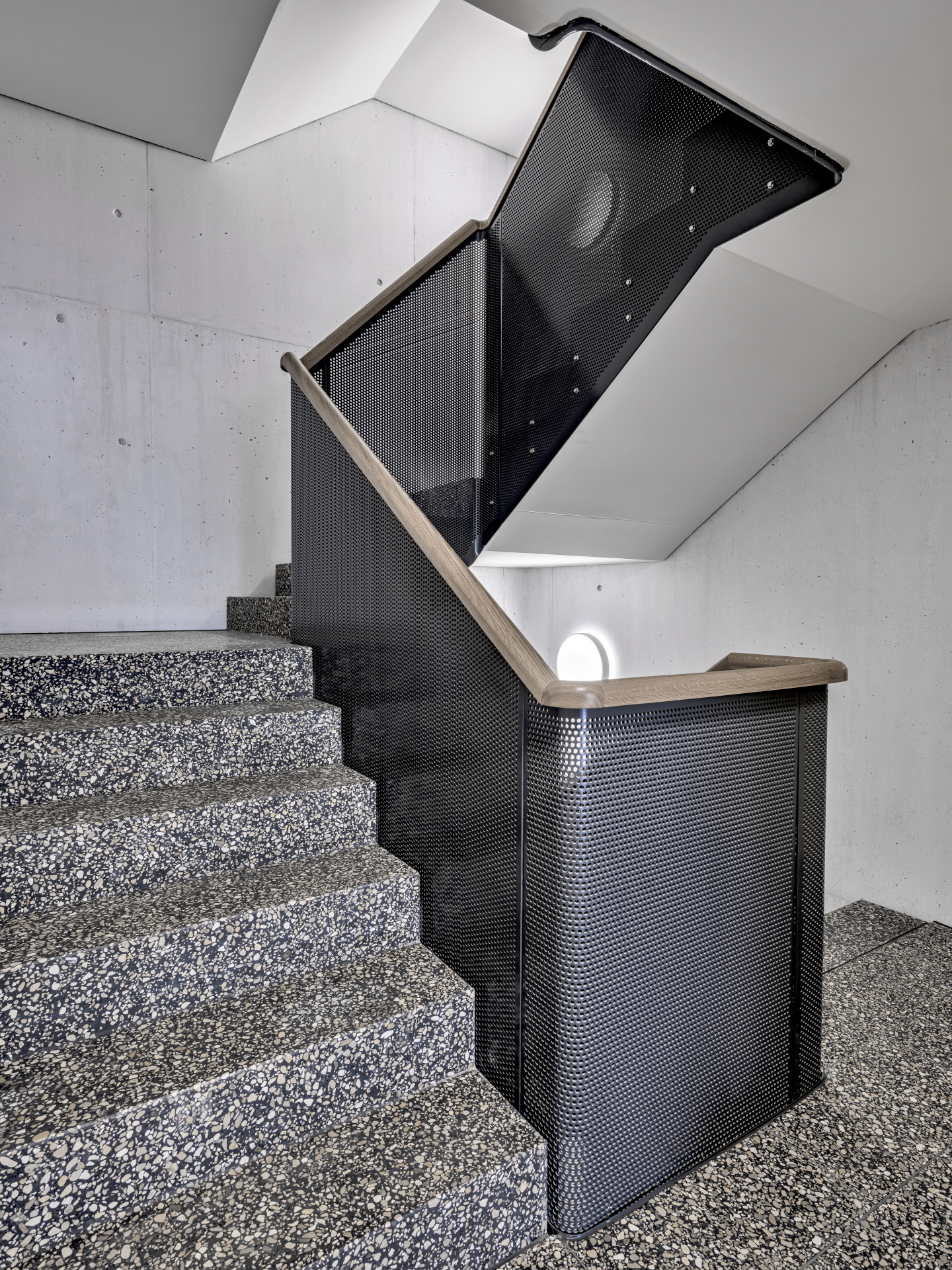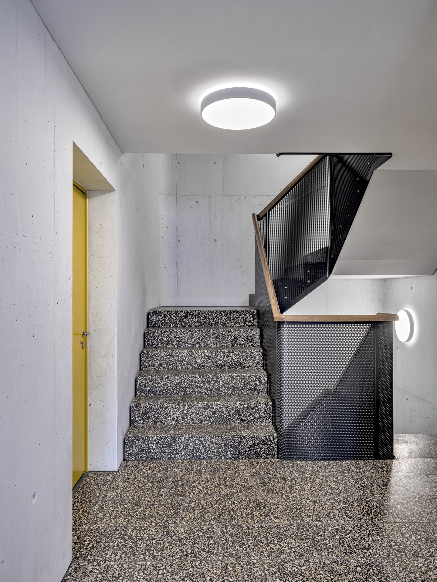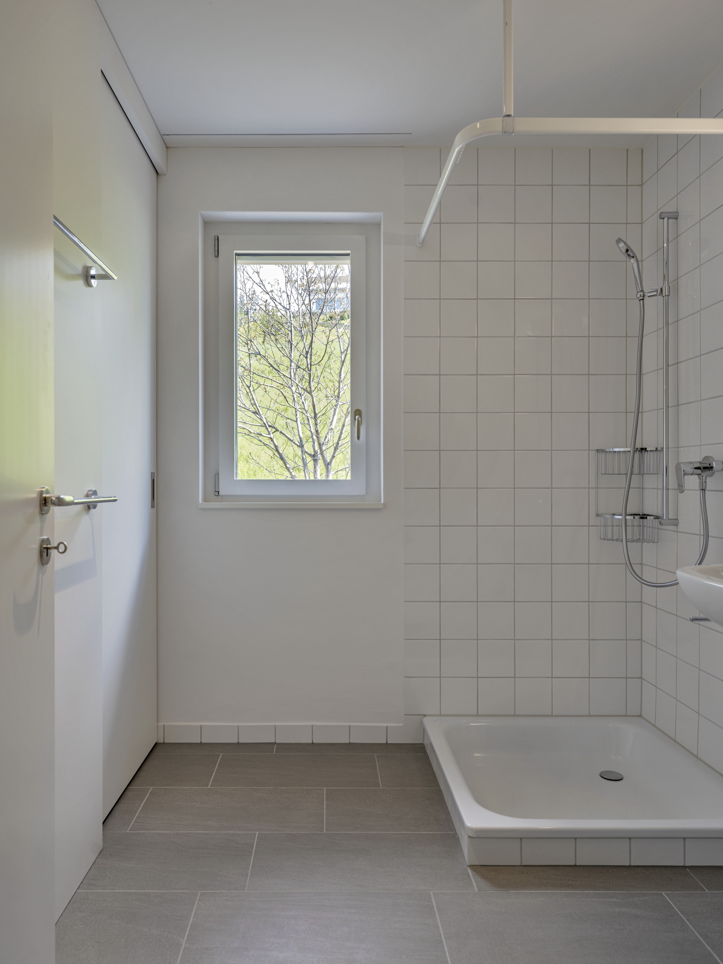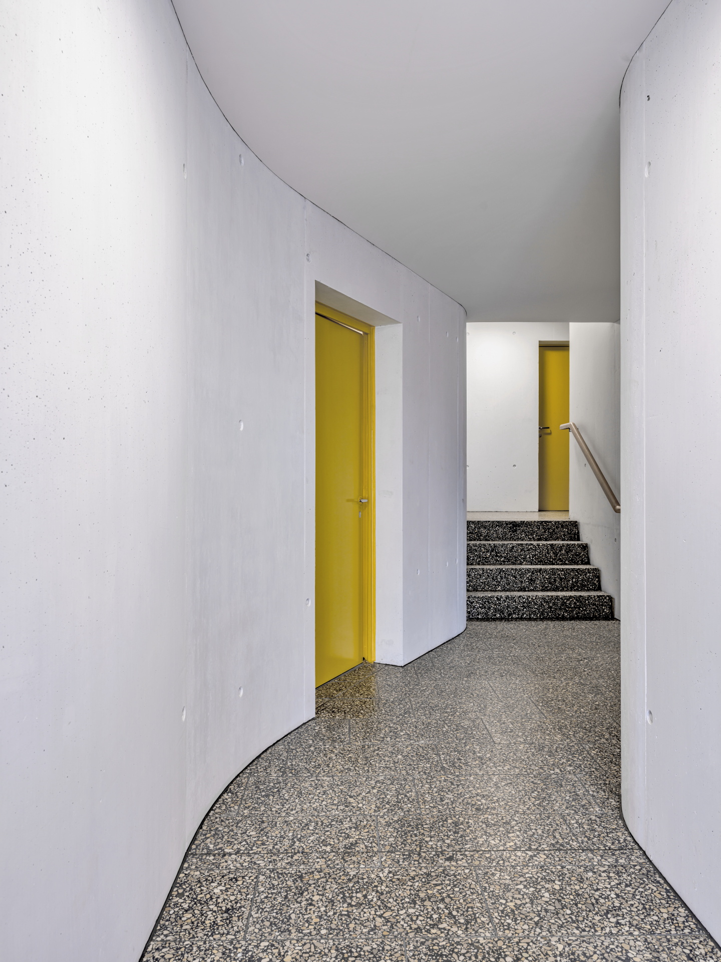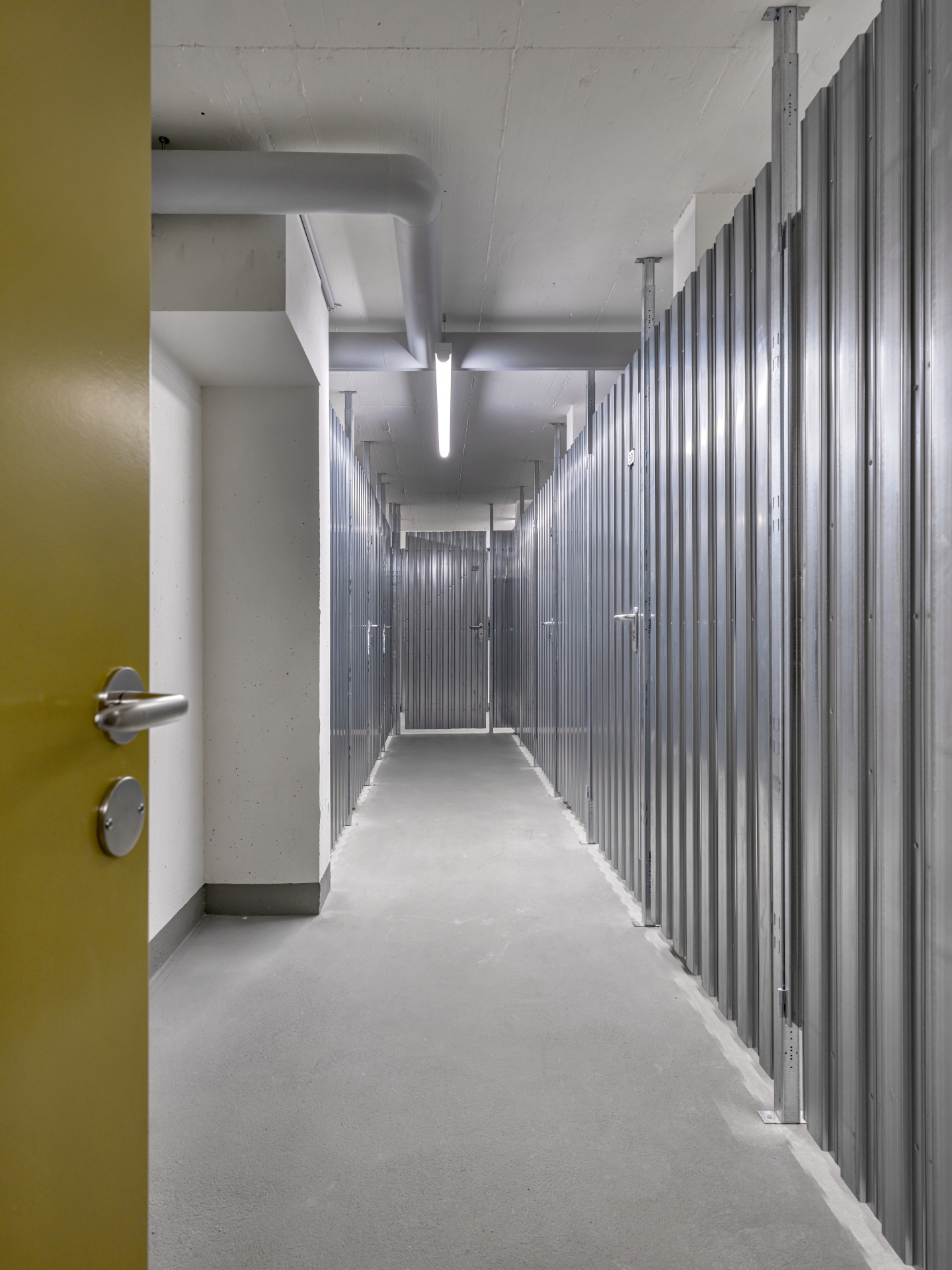 Im Sockel ist Platz für zwei Ateliers mit Kochnische und Toilette sowie zwei nach süd-osten gerichtete 2.5-Zimmer-Wohnungen mit eigenem Garten. Eine Gartenhecke dient den Wohnungen als Sichtschutz.