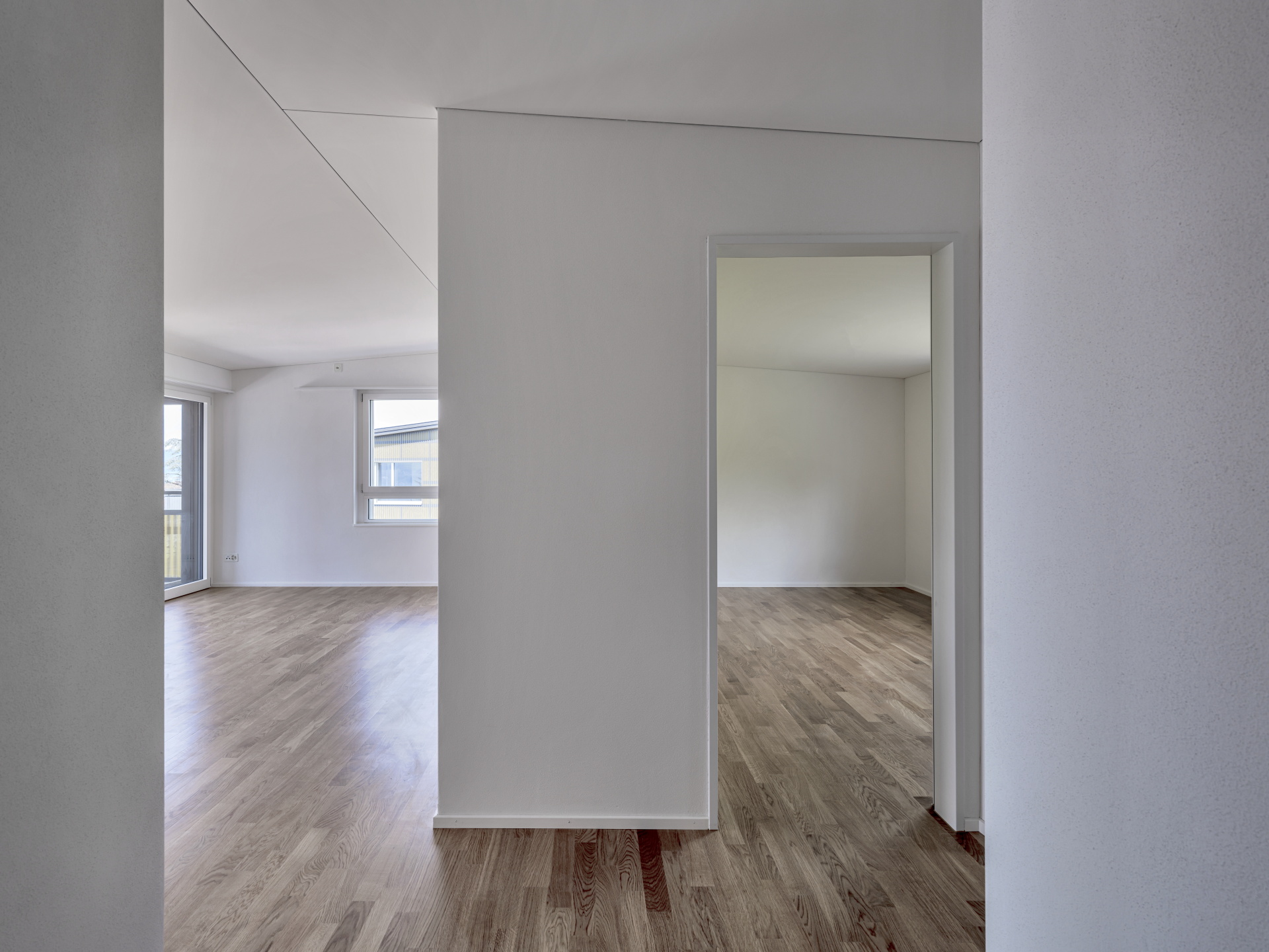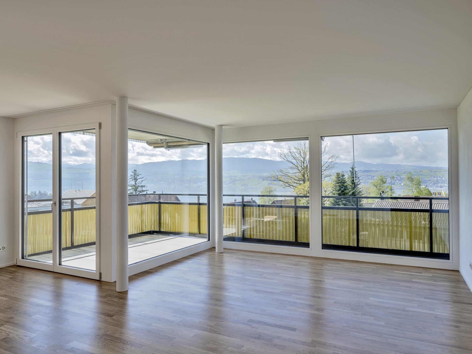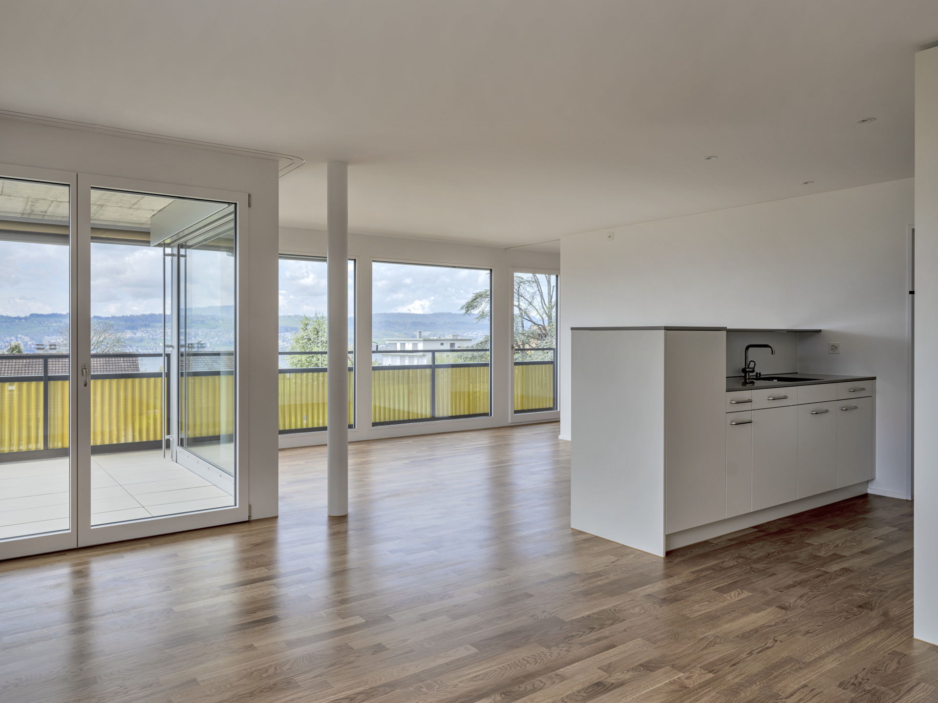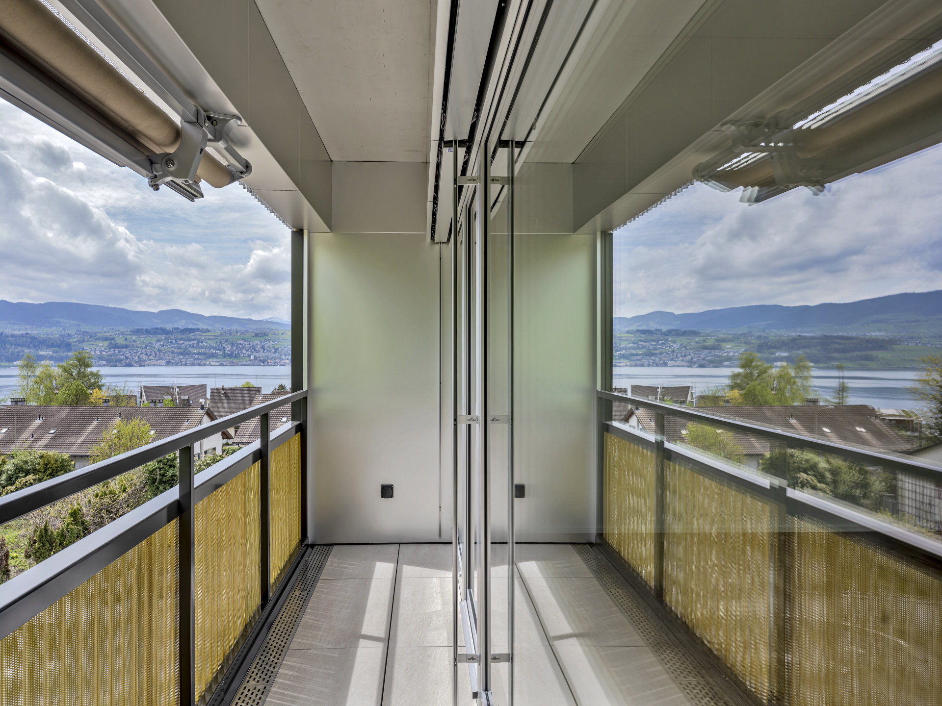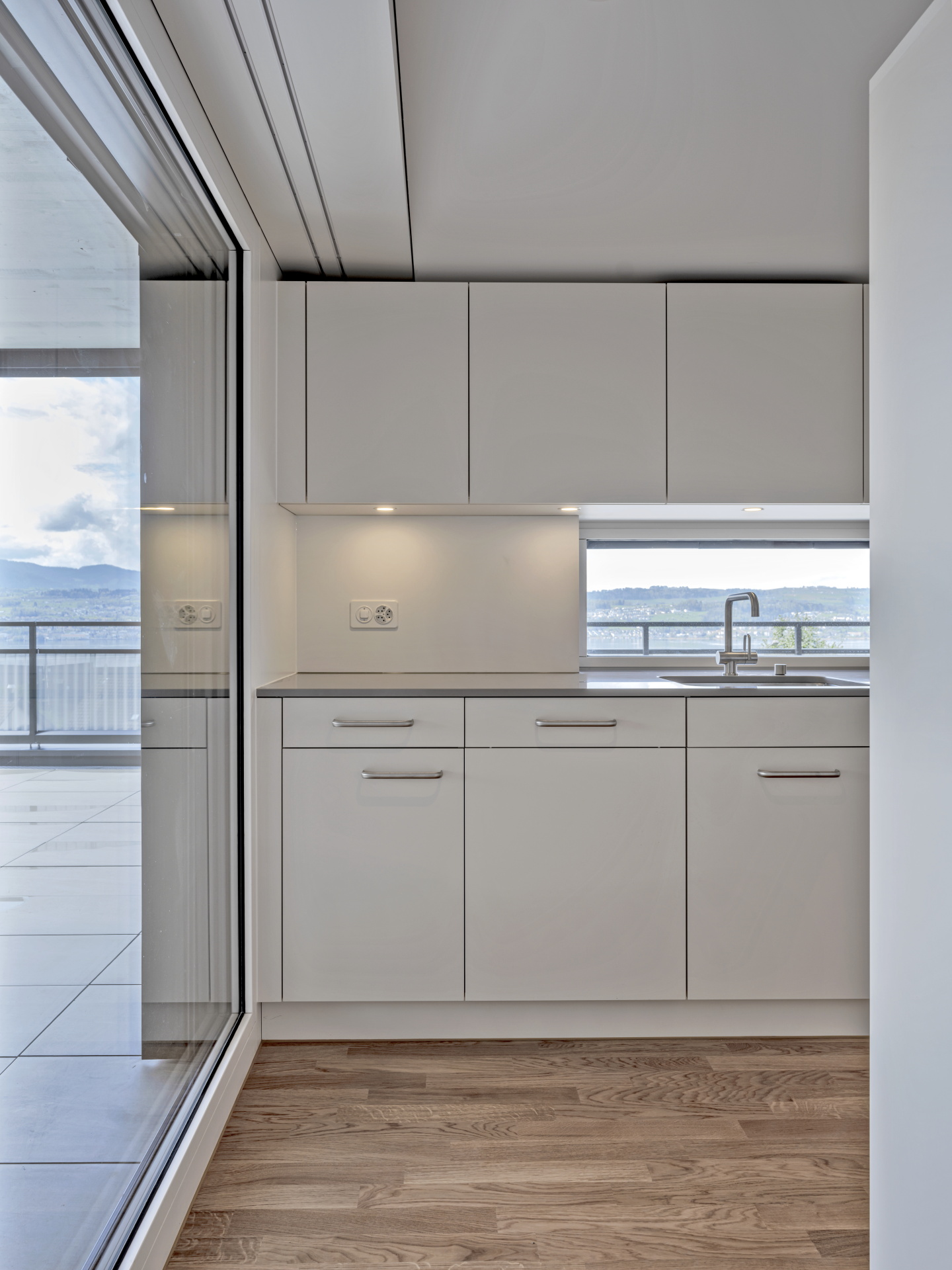 In den Obergeschossen befinden sich vier 2.5- und zwölf 3.5-Zimmer-Wohnungen. Ein Teil der Wohnungen ist zweiseitig orientiert, andere nach Norden ausgerichtet, mit ausreichend Ausblick auf die Berglandschaft. Die Attikawohnungen verfügen über grosszügige Dachterrassen mit uneingeschränkter See- und Weitsicht. Die Wohnräume inklusive Küche sind mit Parkettböden und die Nasszellen mit Plattenbelägen belegt. Zudem verfügen die Nasszellen über eigene Waschtürme. Die offenen Küchen sind mit modernen Geräten von V-Zug und je nach Wohnungstyp mit einer Kochinsel ausgestattet.