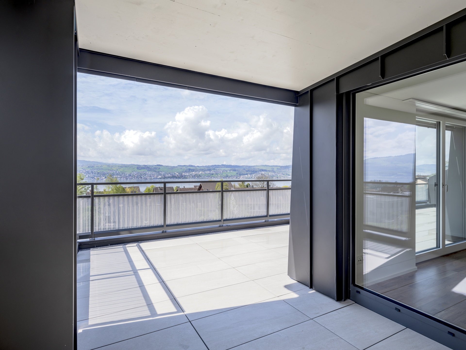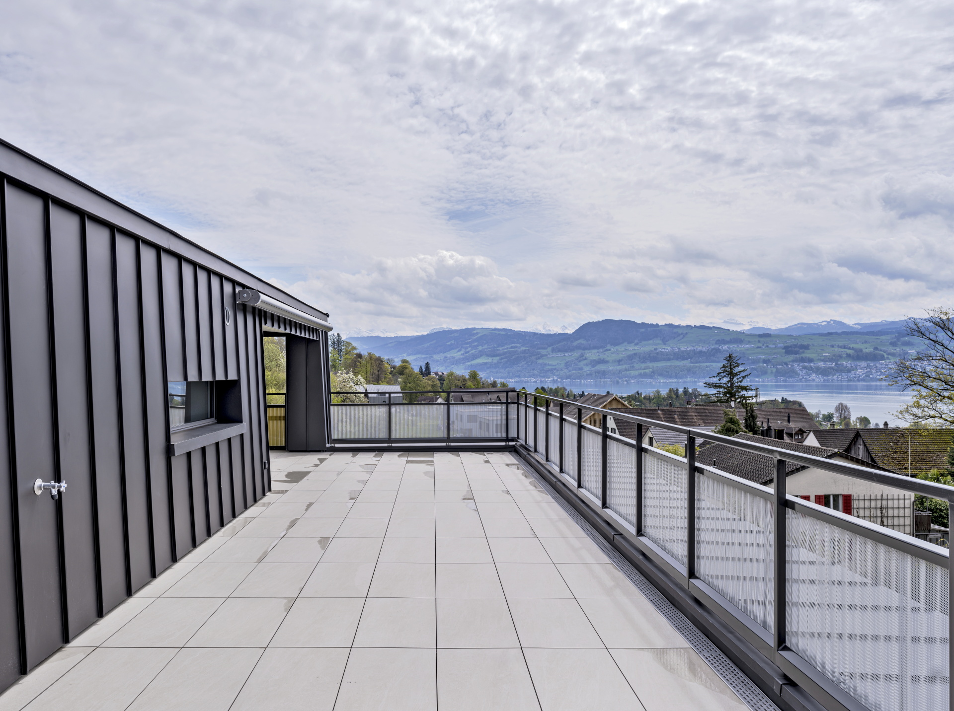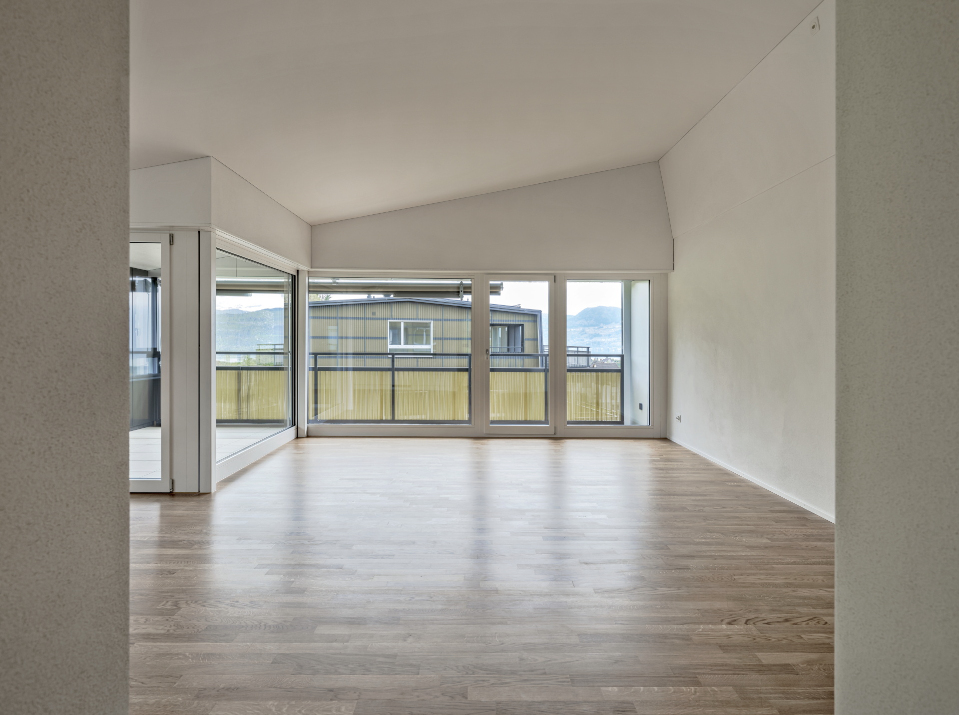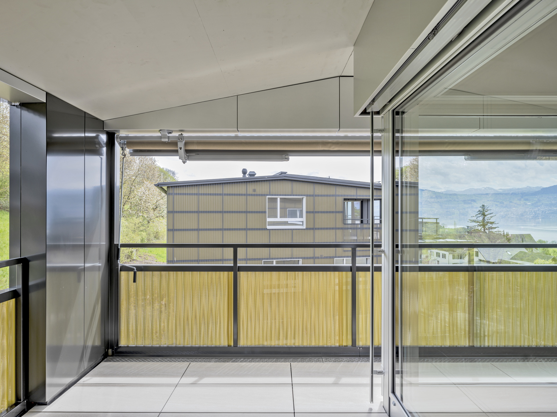 In den Obergeschossen befinden sich vier 2.5- und zwölf 3.5-Zimmer-Wohnungen. Ein Teil der Wohnungen ist zweiseitig orientiert, andere nach Norden ausgerichtet, mit ausreichend Ausblick auf die Berglandschaft. Die Attikawohnungen verfügen über grosszügige Dachterrassen mit uneingeschränkter See- und Weitsicht. Die Wohnräume inklusive Küche sind mit Parkettböden und die Nasszellen mit Plattenbelägen belegt. Zudem verfügen die Nasszellen über eigene Waschtürme. Die offenen Küchen sind mit modernen Geräten von V-Zug und je nach Wohnungstyp mit einer Kochinsel ausgestattet.
