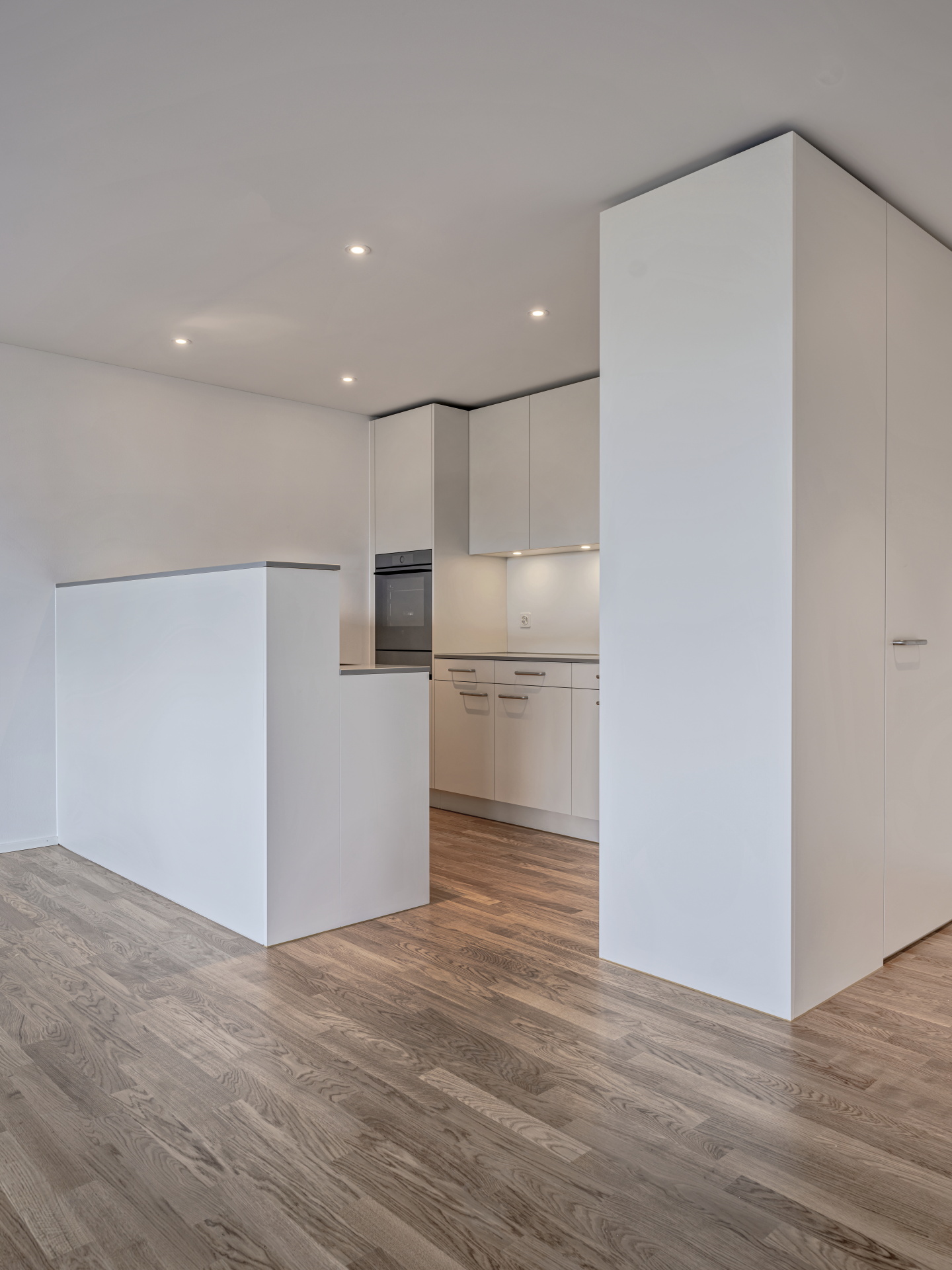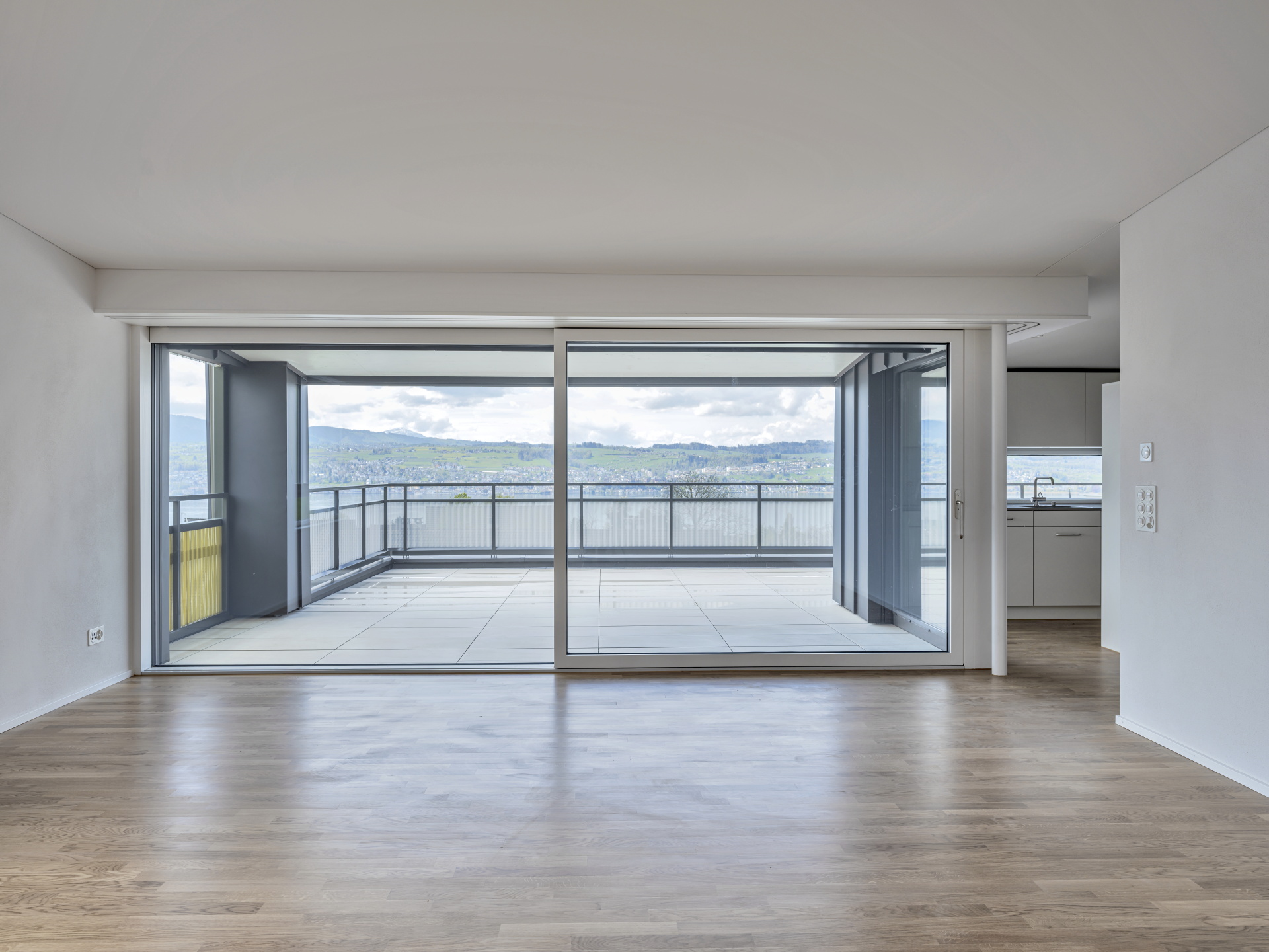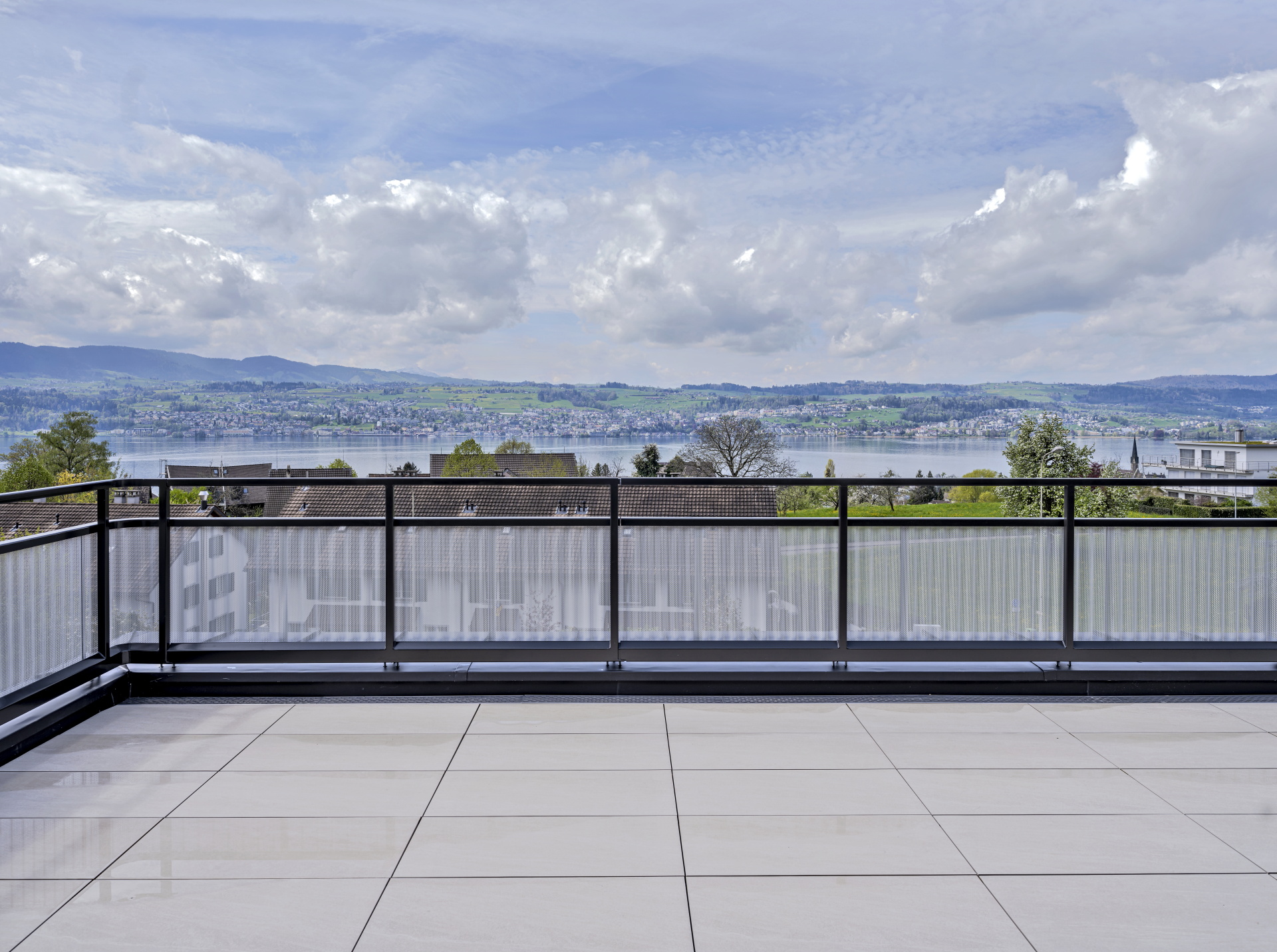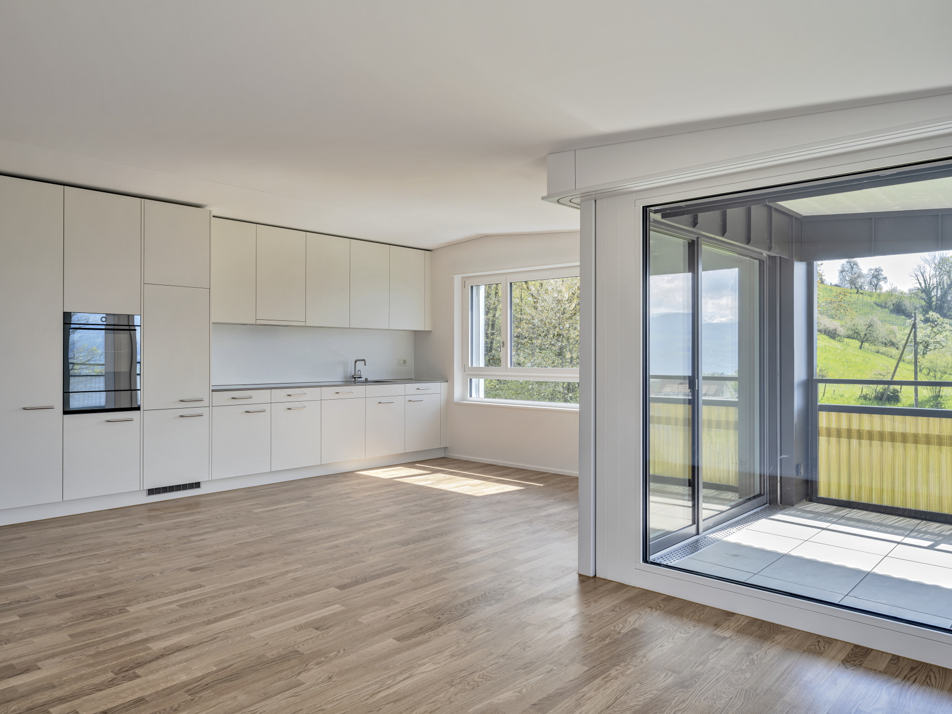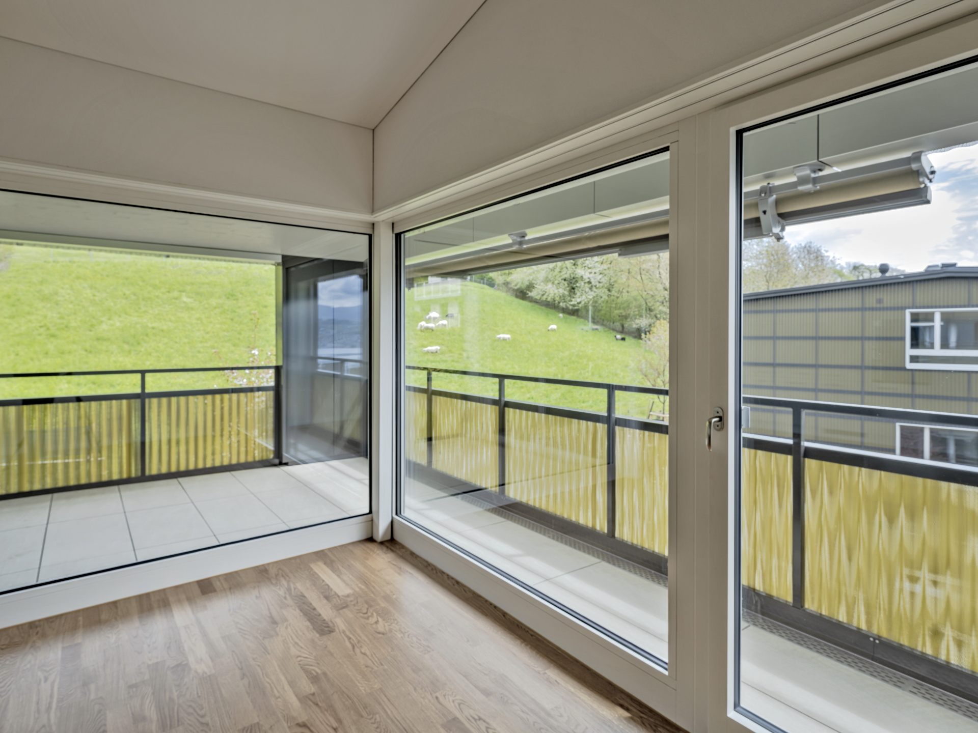 In den Obergeschossen befinden sich vier 2.5- und zwölf 3.5-Zimmer-Wohnungen. Ein Teil der Wohnungen ist zweiseitig orientiert, andere nach Norden ausgerichtet, mit ausreichend Ausblick auf die Berglandschaft. Die Attikawohnungen verfügen über grosszügige Dachterrassen mit uneingeschränkter See- und Weitsicht. Die Wohnräume inklusive Küche sind mit Parkettböden und die Nasszellen mit Plattenbelägen belegt. Zudem verfügen die Nasszellen über eigene Waschtürme. Die offenen Küchen sind mit modernen Geräten von V-Zug und je nach Wohnungstyp mit einer Kochinsel ausgestattet.
