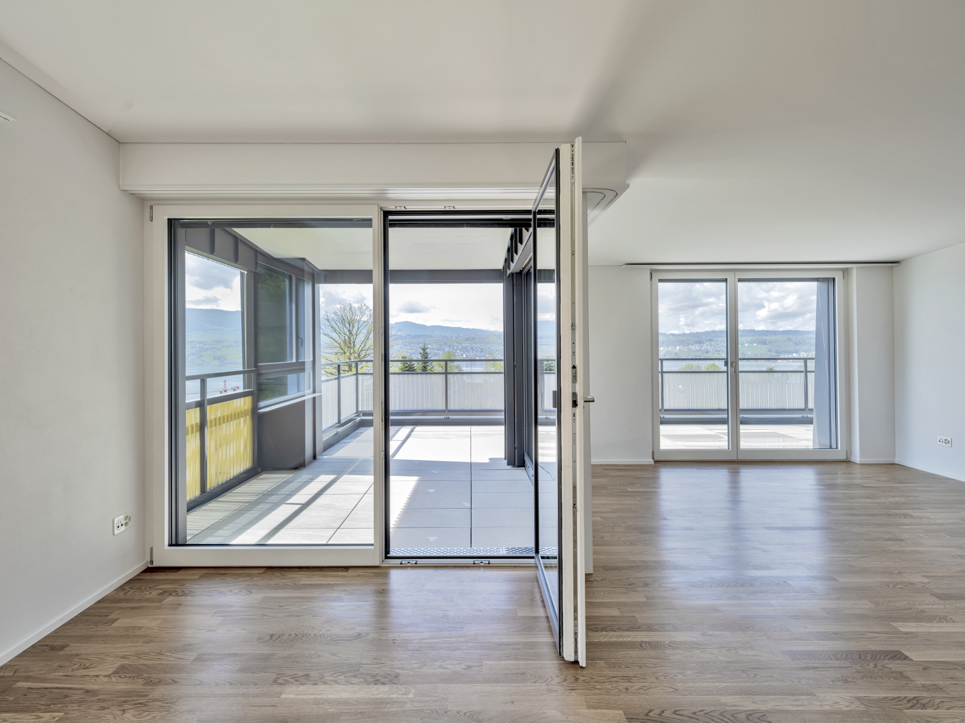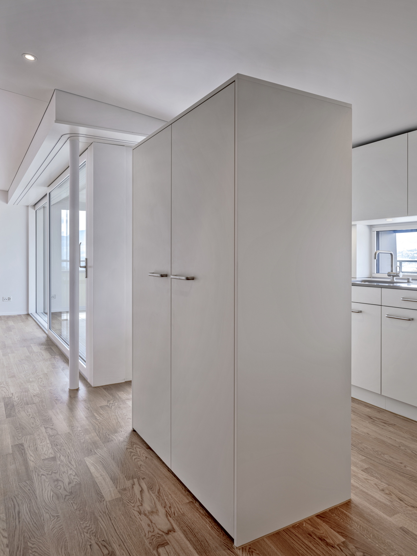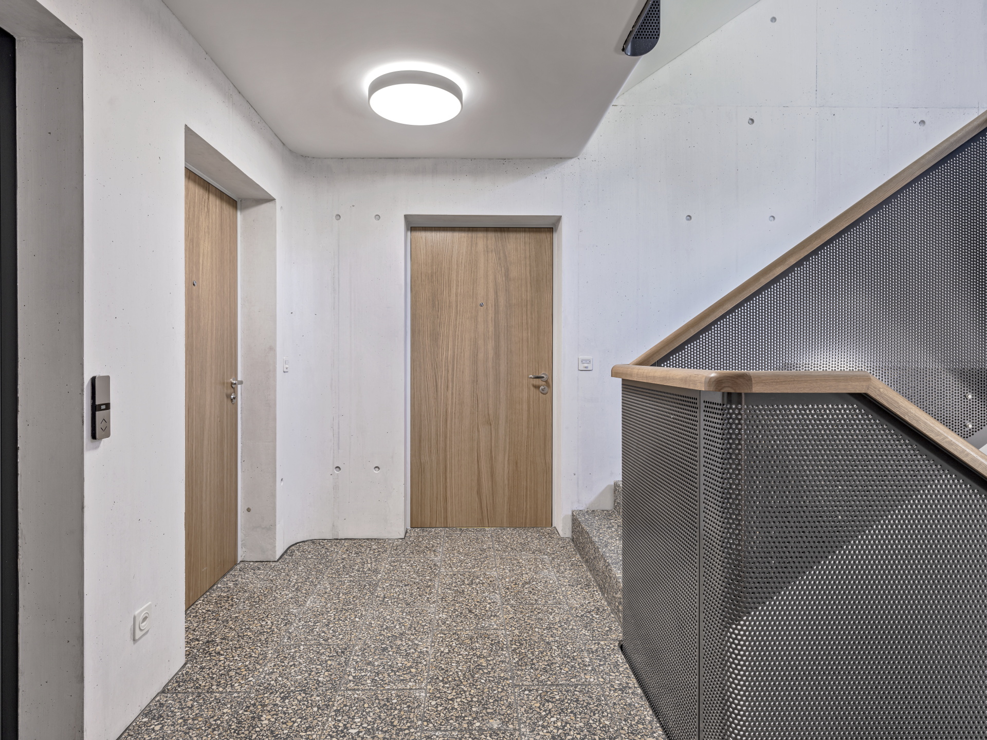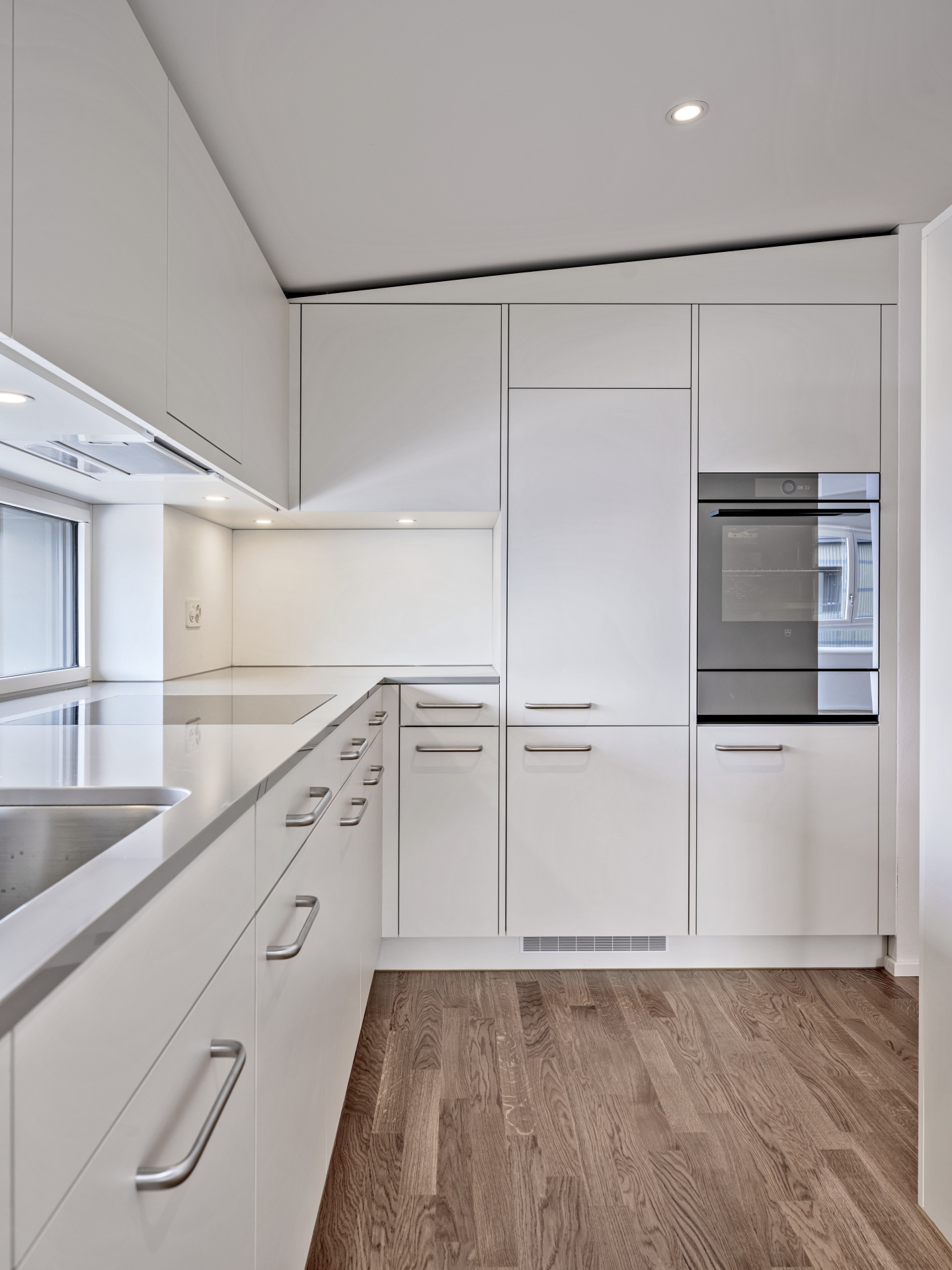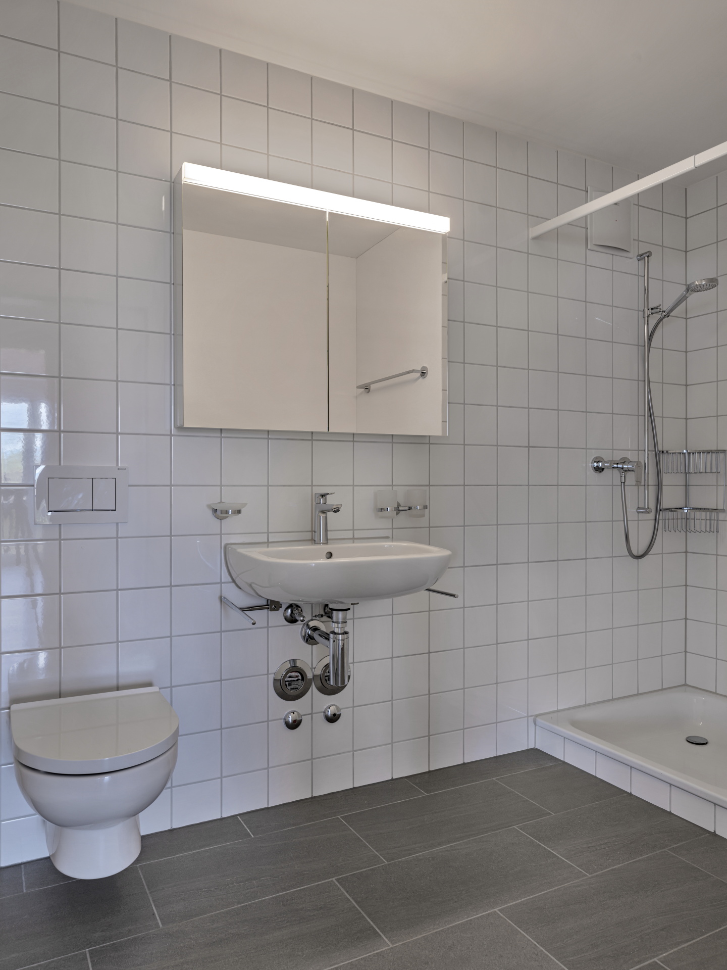 In den Obergeschossen befinden sich vier 2.5- und zwölf 3.5-Zimmer-Wohnungen. Ein Teil der Wohnungen ist zweiseitig orientiert, andere nach Norden ausgerichtet, mit ausreichend Ausblick auf die Berglandschaft. Die Attikawohnungen verfügen über grosszügige Dachterrassen mit uneingeschränkter See- und Weitsicht. Die Wohnräume inklusive Küche sind mit Parkettböden und die Nasszellen mit Plattenbelägen belegt. Zudem verfügen die Nasszellen über eigene Waschtürme. Die offenen Küchen sind mit modernen Geräten von V-Zug und je nach Wohnungstyp mit einer Kochinsel ausgestattet.