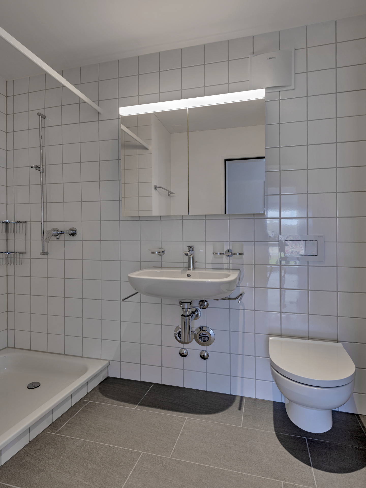 Die beiden Baukörper verlaufen leicht zurückversetzt zur Allenbergstrasse, wo sich auch die beiden Hauseingänge „Im Hänsi 1“ und „Im Hänsi 3“ befinden. Es bleibt genügend Raum für Begegnungen, Veloabstellplätze sowie Besucherparkplätze und Container. Die Garageneinfahrt liegt zwischen den beiden Häusern am tiefsten Punkt des Areals und erschliesst so die 25 Einstellplätze einfach und direkt.