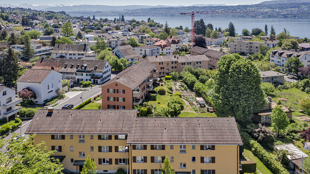 Acht Mehrfamilienhäuser mit 2- bis 5,5-Zimmer-Wohnungen. 10 Aussenparkplätze. Gemüse- und Pflanzengärten. An der Gartenstrasse 22 ist das Domizil der Baugenossenschaft Zürichsee.