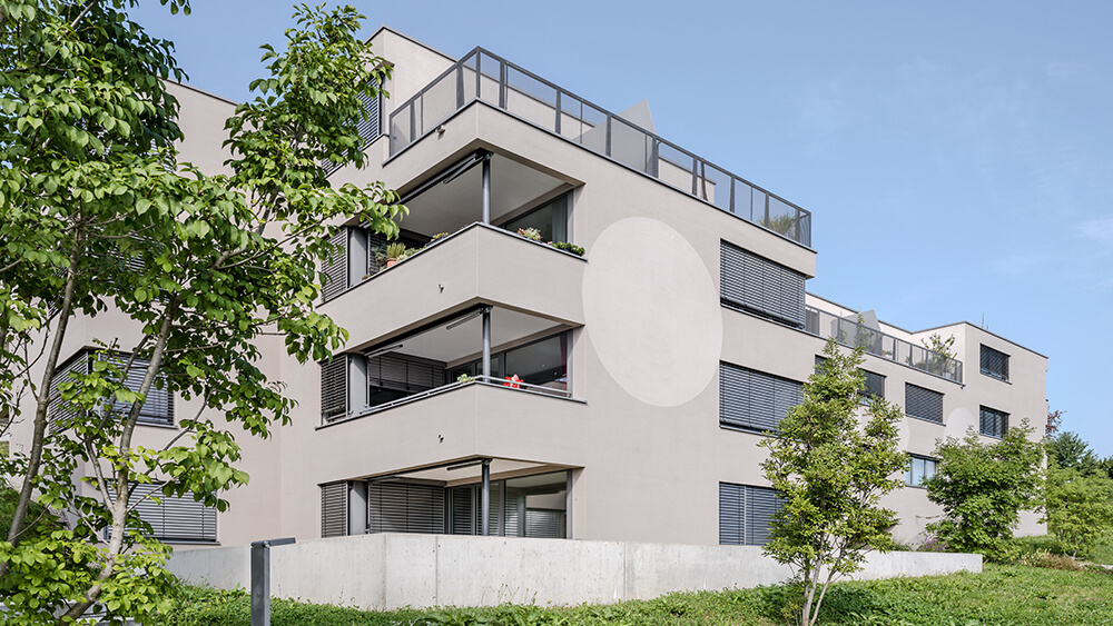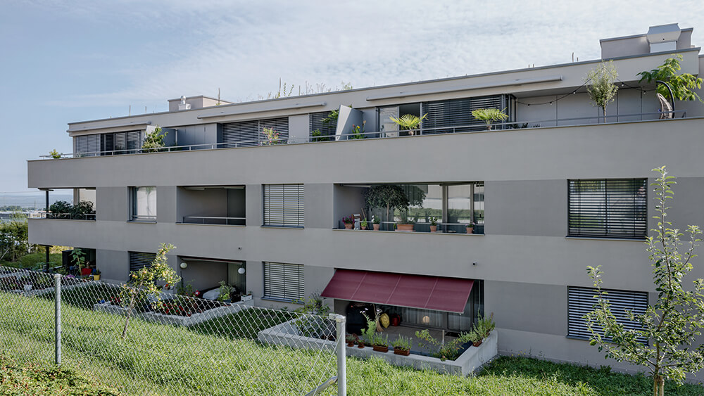 Zwei Mehrfamilienhäuser mit 2,5- und 3,5-Zimmer-Wohnungen sowie zwei Familienwohnungen. Durch Lift erschlossen. Unterniveaugarage (30 Einstellplätze). Kleiner Kinderspielplatz. Bastelräume können dazugemietet werden.